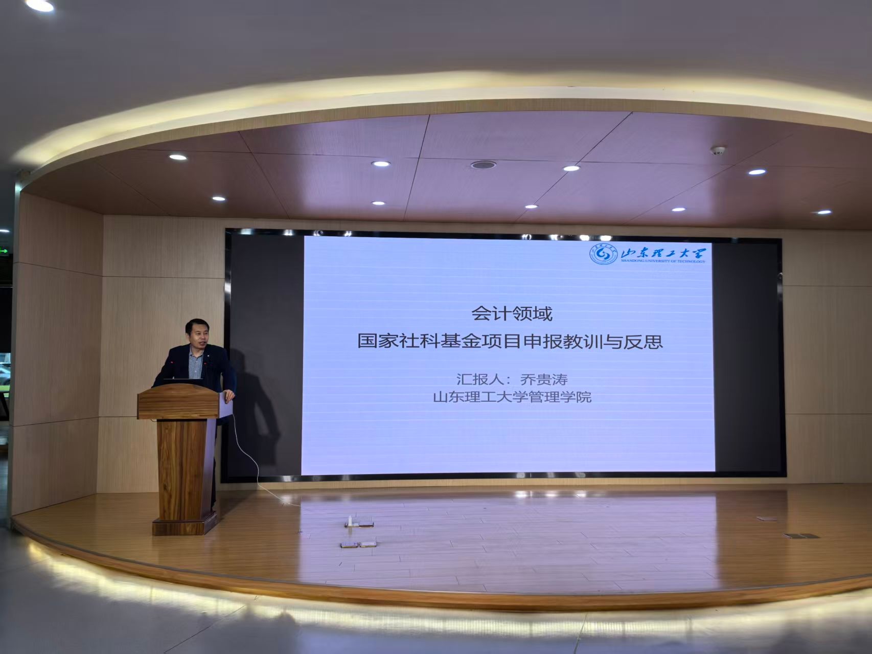 在主题报告环节,乔贵涛教授作了题为《会计领域国家社科基金项目申报教训与反思》的报告。围绕申报教训和申报反思两个角度,从选题、选题说明、选题依据、研究内容、创新之处、研究基础、参考文献、组织工作等方面分享了国家社科基金申报的心得体会。