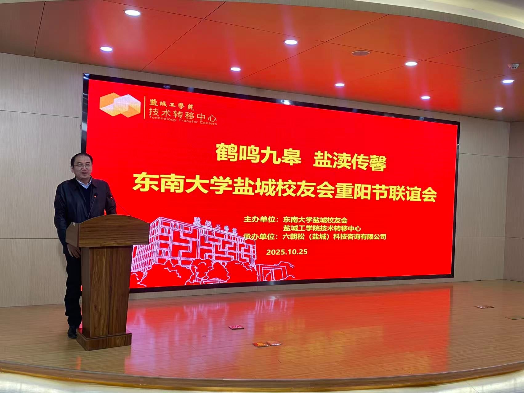 2025年10月25日,以“鹤鸣九皋 盐渎传馨”为主题的东南大学盐城校友会重阳节联谊会在盐城西伏河产学研协同创新中心成功举办。本次活动由东南大学盐城校友会、盐城工学院技术转移中心主办,六朝松(盐城)科技咨询有限公司承办。